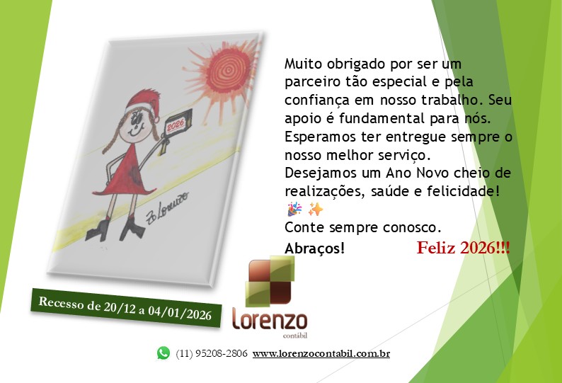 Categorias Alteração de Rotina (16) Contas a Pagar - Impostos (31) Expediente (31) Documentação (19) 18/12/2025 - RECESSO17/12/2025 - Cronograma de Fim de Ano - 2º AVISO09/12/2025 - TRIBUTAÇÃO NOS LUCROS DA EMPRESA - URGENTE!04/12/2025 - NOTA DE FALECIMENTO01/12/2025 - GOLPES QUE UTILIZAM DARFS FALSOS 28/11/2025 - TRIBUTAÇÃO NOS LUCROS DA EMPRESA - URGENTE!18/11/2025 - EXPEDIENTE - FERIADO - DIA NACIONAL DA CONSCIÊNCIA NEGRA17/11/2025 - CRIPTOMOEDAS17/11/2025 - REFORMA TRIBUTÁRIA13/11/2025 - Cronograma de Fim de Ano 1 2 3 4 5 6 > Última Página Se você não deseja mais receber nossos boletins preencha o cadastro abaixo: